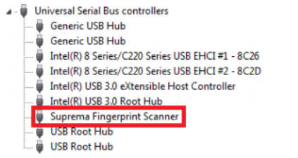 Open device manager and check that Suprema Fingerprint Scanner is detected properly.