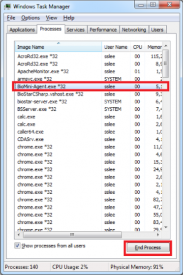 In BioStar 2.3 or below the service will appear as Biomini-Agent.exe *32