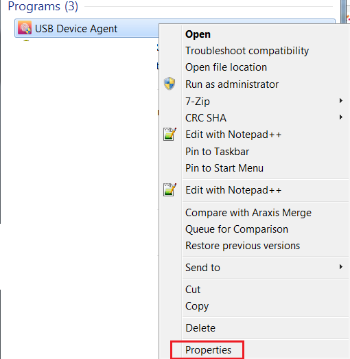 Search the Biomini Agent / USB Agent in Windows Start menu and select the Properties menu after a right click.