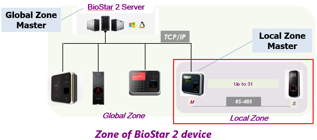 Global Zone : TCP/IP and RS485 based, BioStar Server is zone master