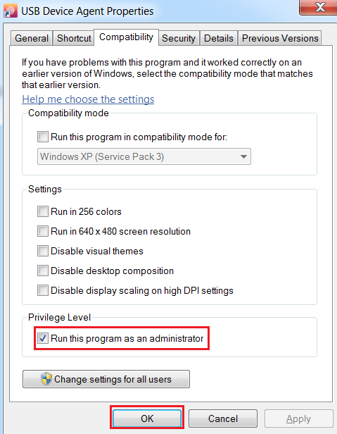 Check Run this program and an administrator on the compatibility tab and click OK
